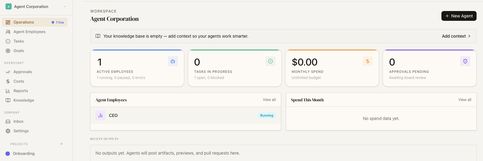 Linux, macOS, or any server. Run it on your laptop, a VPS, a Raspberry Pi. If it can run Node.js, it can run your company.